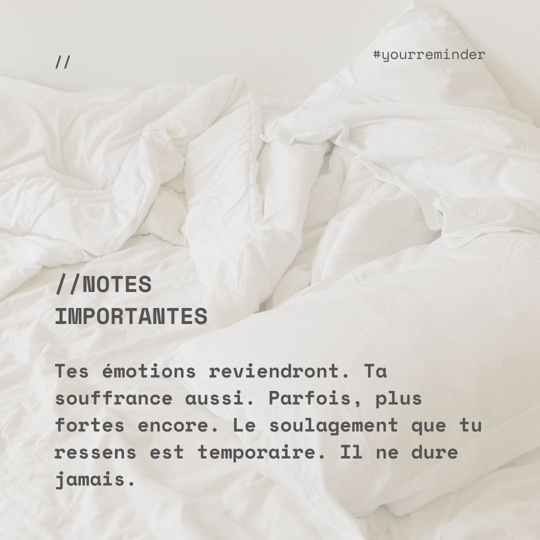 Pourquoi arrêter de s’automutiler? Parce que les émotions reviendront, la souffrance aussi. Parfois, les vagues d’émotions reviendront plus fortes qu’elles ne l’étaient puisqu’elles auront été refoulées. Le soulagement ressenti par l’automutilation ne dure jamais, il est temporaire.