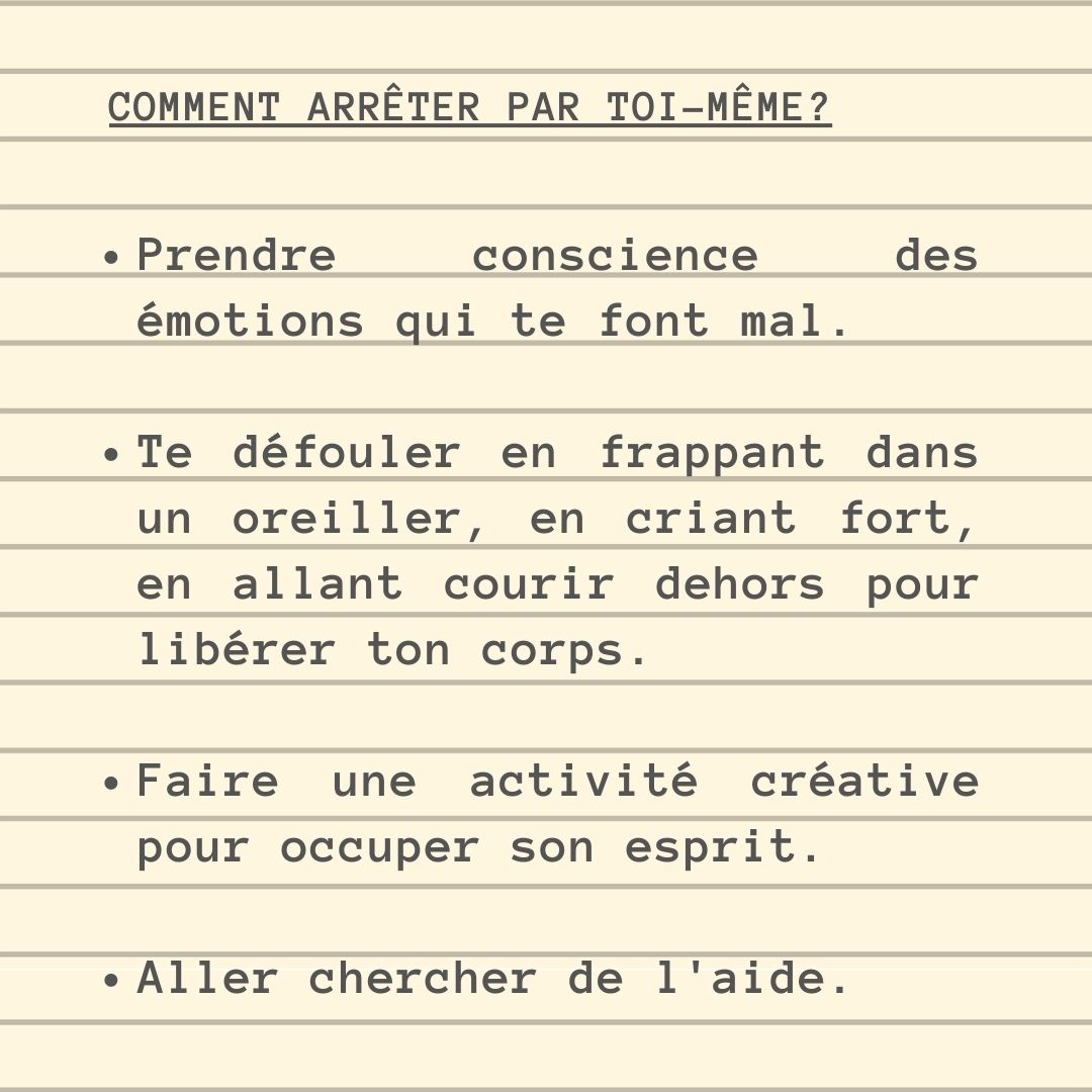 Est-ce possible d’arrêter de s’automutiler par soi-même? Oui, c’est possible, mais c’est toujours possible (et recommandé) de demander de l’aide à un professionnel de la santé. D’abord, identifie et prends conscience des émotions et situations qui te font mal. Ensuite, découvre de nouveaux moyens pour te défouler, soit en frappant dans un oreiller, en criant fort, en allant courir ou en occupant ton esprit à une activité artistique.