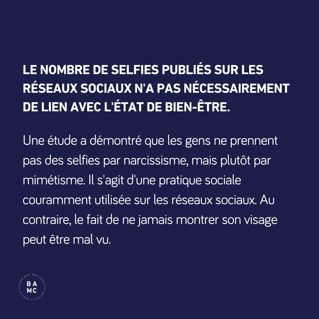 De même, le nombre de selfies publiés sur les réseaux sociaux n’a pas nécessairement de lien avec notre état de bien-être. Une étude a démontré que les gens ne prennent pas des selfies par narcissisme, mais plutôt par mimétisme. Il s’agit d’une pratique sociale couramment utilisée sur les réseaux sociaux. Au contraire, le fait de ne jamais montrer son visage peut être mal vu.