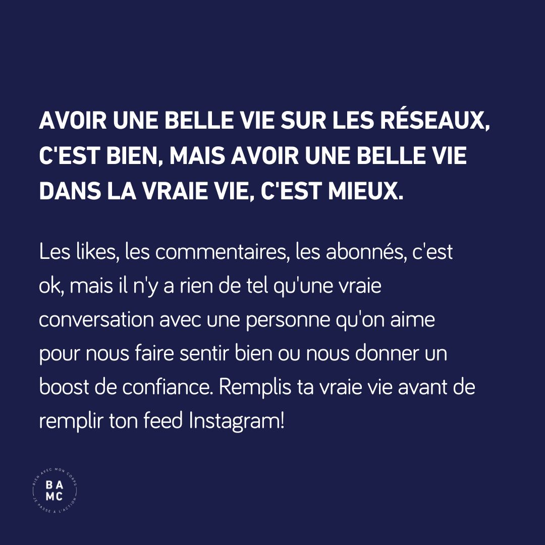 Bien sûr, avoir une belle vie sur les réseaux sociaux, c’est bien, mais avoir une belle vie dans la vraie vie, c’est mieux. Les likes, les commentaires, les abonnés, c’est ok, mais il n’y a rien de tel qu’une vraie conversation avec une personne qu’on aime pour nous faire sentir bien ou nous donner un boost de confiance. Remplis ta vraie vie avant de remplir ton feed Instagram!