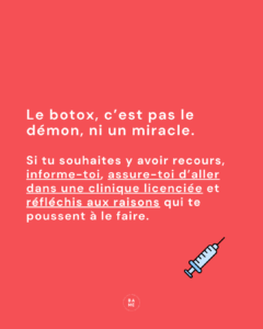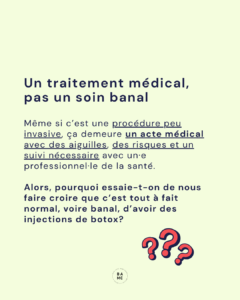 Même si c’est une procédure peu invasive, ça demeure un acte médical avec des aiguilles, des risques et un suivi nécessaire avec un·e professionnel·le de la santé. Alors, pourquoi essaie-t-on de nous faire croire que c’est tout à fait normal, voire banal, d’avoir des injections de botox?