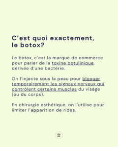 Le botox, c’est la marque de commerce pour parler de la toxine botulinique, dérivée d’une bactérie. On l’injecte sous la peau pour bloquer temporairement les signaux nerveux qui contrôlent certains muscles du visage (ou du corps). En chirurgie esthétique, on l’utilise pour limiter l’apparition de rides.