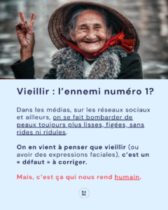 Dans les médias, sur les réseaux sociaux et ailleurs, on se fait bombarder de peaux toujours plus lisses, figées, sans rides ni ridules. On en vient à penser que vieillir (ou avoir des expressions faciales), c’est un « défaut » à corriger. Mais, c’est ça qui nous rend humain.