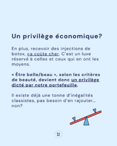 En plus, recevoir des injections de botox, ça coûte cher. C’est un luxe réservé à celles et ceux qui en ont les moyens. « Être belle/beau », selon les critères de beauté, devient donc un privilège dicté par notre portefeuille. Il existe déjà une tonne d’inégalités classistes, pas besoin d’en rajouter… non?
