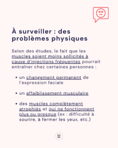 Selon des études, le fait que les muscles soient moins sollicités à cause d’injections fréquentes pourrait entraîner chez certaines personnes :