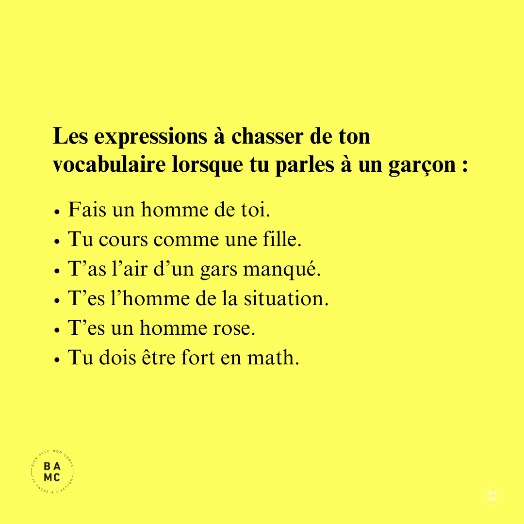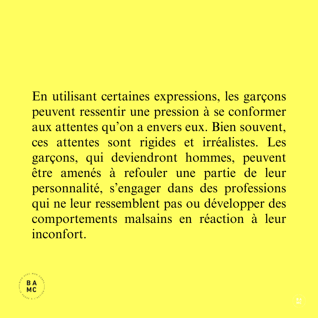 En utilisant certaines expressions, les garçons peuvent ressentir une pression à se conformer aux attentes qu’on a envers eux. Bien souvent, ces attentes sont rigides et irréalistes. Les garçons, qui deviendront hommes, peuvent être amenés à refouler une partie de leur personnalité, s’engager dans des professions qui ne leur ressemblent pas ou développer des comportements malsains en réaction à leur inconfort.