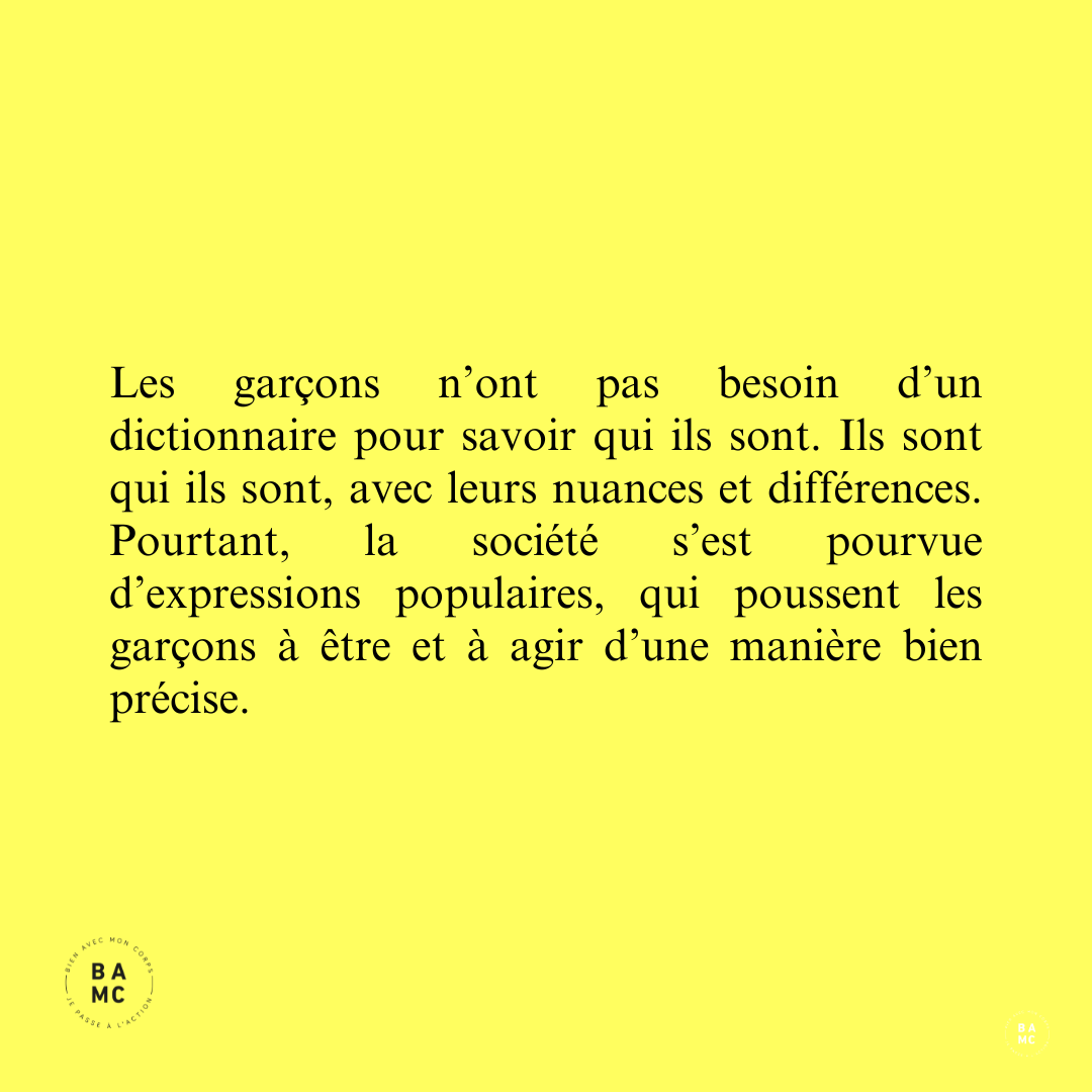 Les garçons n’ont pas besoin d’un dictionnaire pour savoir qui ils sont. Ils sont qui ils sont, avec leurs nuances et différences. Pourtant, la société s’est pourvue d’expressions populaires, qui poussent les garçons à être et à agir d’une manière bien précise.