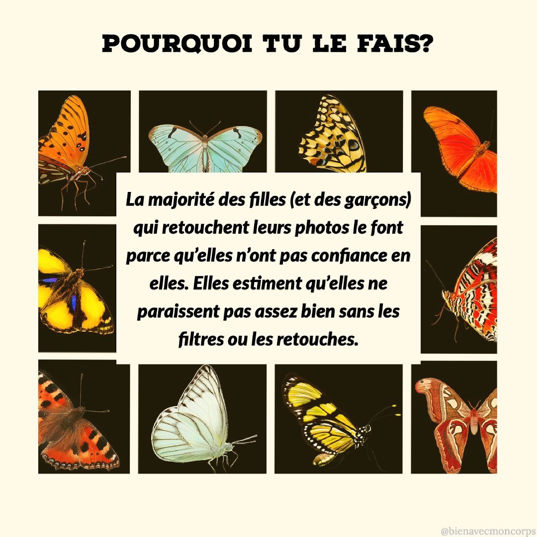 La majorité des filles (et des garçons aussi ) qui retouchent leurs photos le font parce qu’elles n’ont pas confiance en elles. Elles estiment qu’elles ne paraissent pas assez bien sans les filtres ou les retouches que leur propose ces applications.