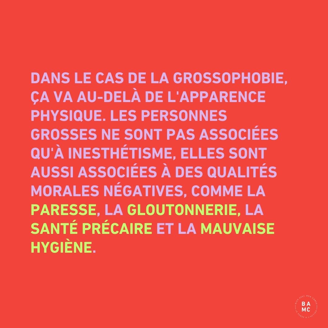 Dans le cas de la grossophobie, les préjugés vont au-delà de l’apparence physique. En effet, les personnes grosses sont aussi associées à des qualités morales négatives, comme la paresse, la gloutonnerie, la mauvaise hygiène et la mauvaise hygiène.