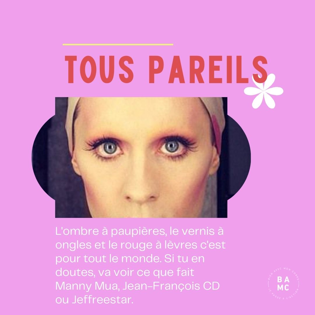L’ombre à paupières, le vernis à ongles et le rouge à lèvres c’est pour tout le monde. Pour se maquiller, il suffit d’avoir des yeux, des pommettes et des lèvres.
