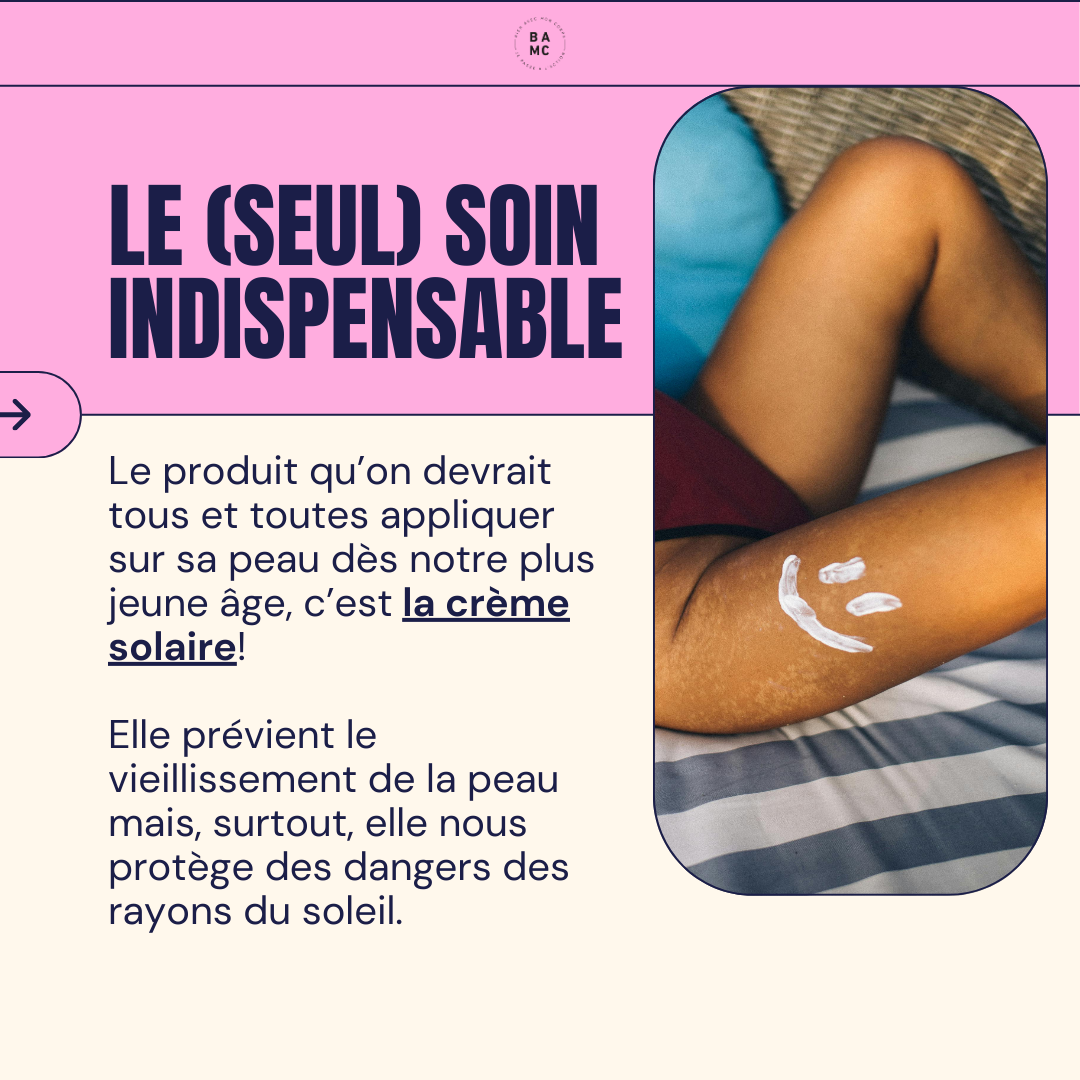 Le produit qu’on devrait tous et toutes appliquer sur sa peau dès notre plus jeune âge, c’est la crème solaire! Elle prévient le vieillissement de la peau mais, surtout, elle nous protège des dangers des rayons du soleil.