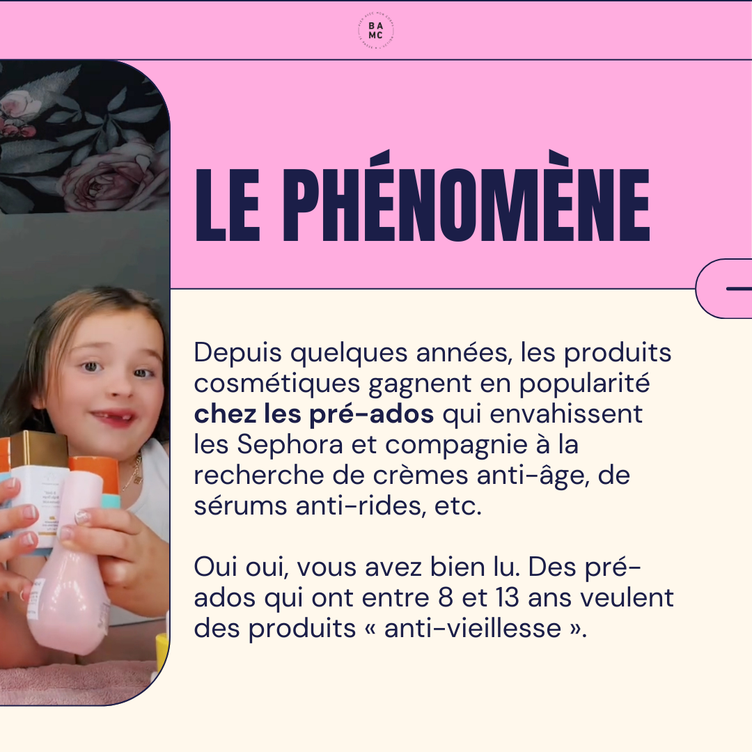 Depuis quelques années, les produits cosmétiques gagnent en popularité chez les pré-ados qui envahissent les Sephora et compagnie à la recherche de crèmes anti-âge, de sérums anti-rides, etc. Oui oui, vous avez bien lu. Des pré-ados qui ont entre 8 et 13 ans veulent des produits « anti-vieillesse ».