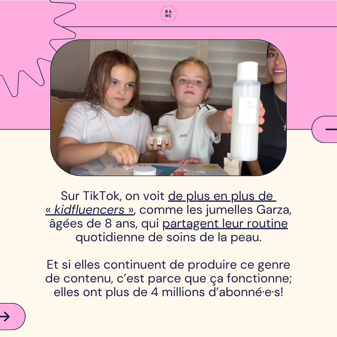 Sur TikTok, on voit de plus en plus de « kidfluencers », comme les jumelles Garza, âgées de 8 ans, qui partagent leur routine quotidienne de soins de la peau. Et si elles continuent de produire ce genre de contenu, c’est parce que ça fonctionne; elles ont plus de 4 millions d’abonné·e·s!