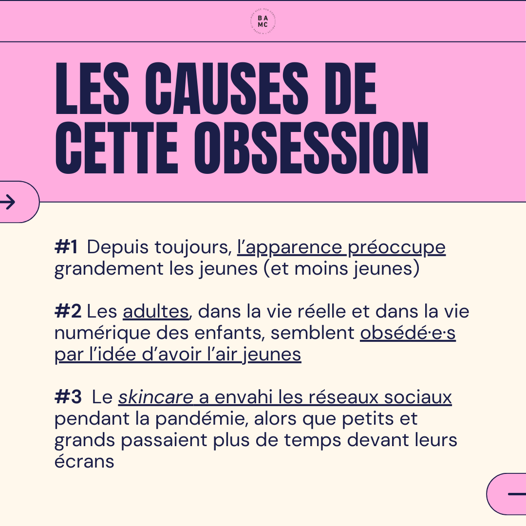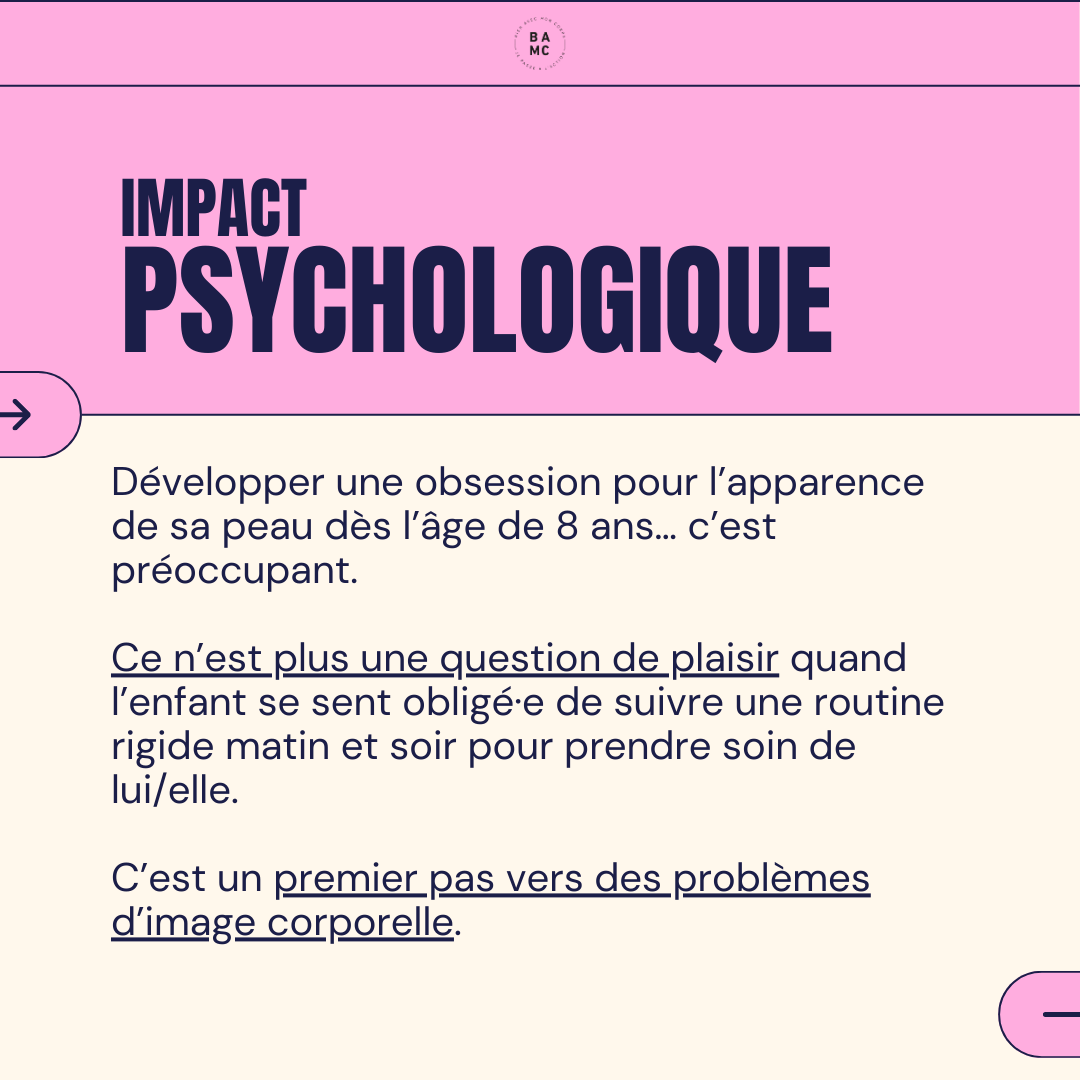 Développer une obsession pour l’apparence de sa peau dès l’âge de 8 ans… c’est préoccupant. Ce n’est plus une question de plaisir quand l’enfant se sent obligé·e de suivre une routine rigide matin et soir pour prendre soin de lui/elle. C’est un premier pas vers des problèmes d’estime de soi.