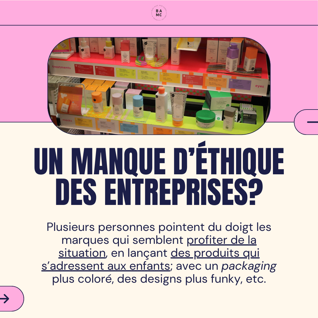 Plusieurs personnes pointent du doigt les marques qui semblent profiter de la situation, en lançant des produits qui s’adressent aux enfants; avec un packaging plus coloré, des designs plus funky, etc.