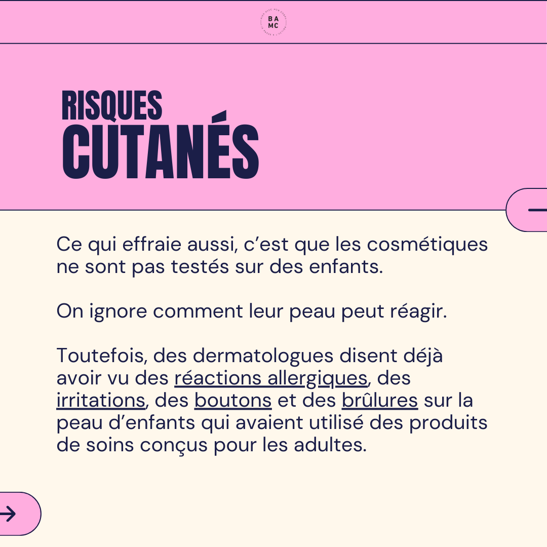 Ce qui effraie aussi, c’est que les cosmétiques ne sont pas testés sur des enfants. On ignore comment leur peau peut réagir.