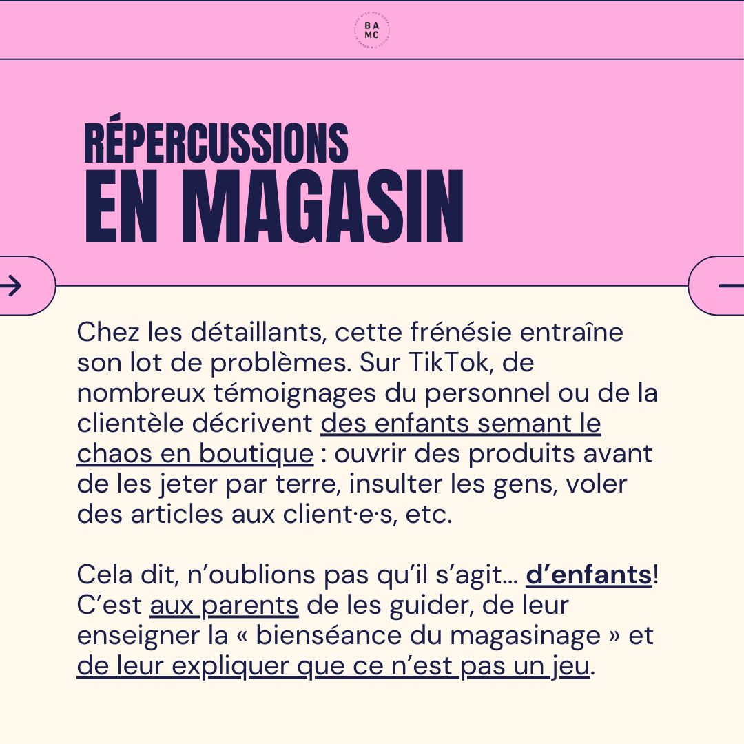 Chez les détaillants, cette frénésie entraîne son lot de problèmes. Sur TikTok, de nombreux témoignages du personnel ou de la clientèle décrivent des enfants semant le chaos en boutique : ouvrir des produits avant de les jeter par terre, insulter les gens, voler des articles aux client·e·s, etc.