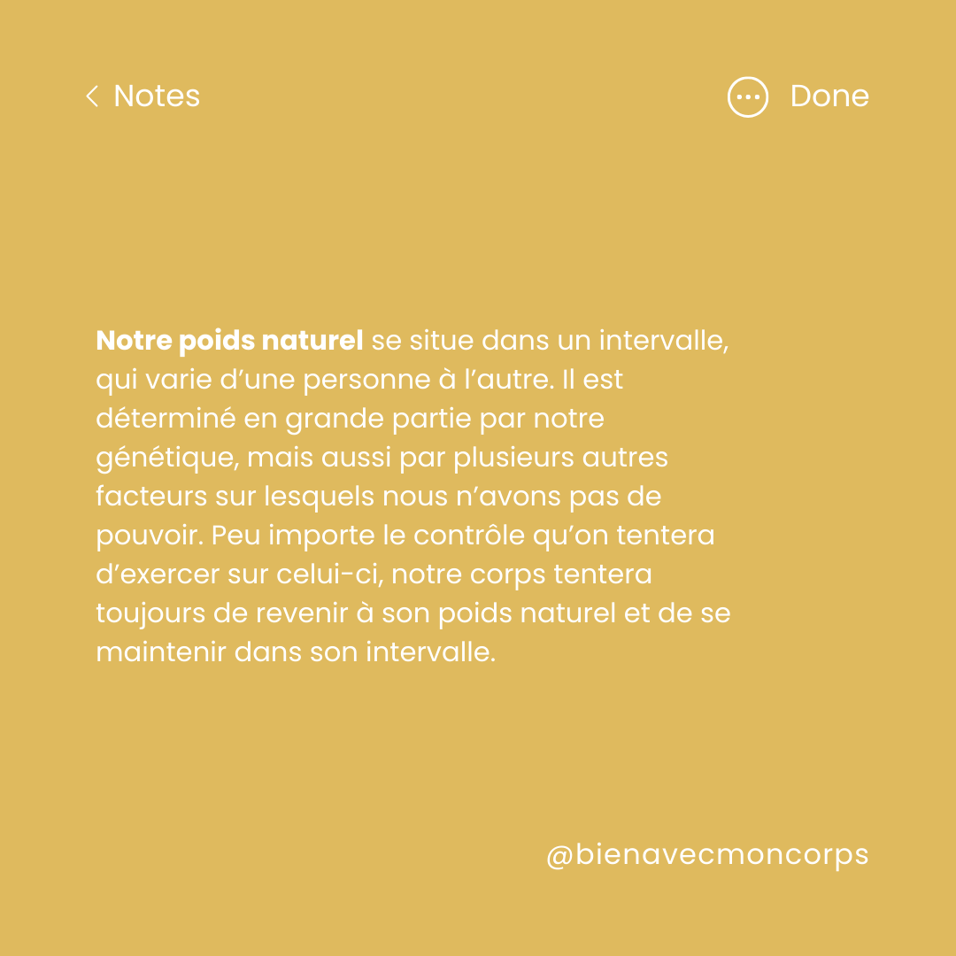 Notre poids naturel se situe dans un intervalle, qui varie d’une personne à l’autre. Il est déterminé en grande partie par notre génétique, mais aussi par plusieurs autres facteurs sur lesquels nous n’avons pas de pouvoir. Peu importe le contrôle qu’on tentera d’exercer sur celui-ci, notre corps tentera toujours de revenir à son poids naturel et de se maintenir dans son intervalle.