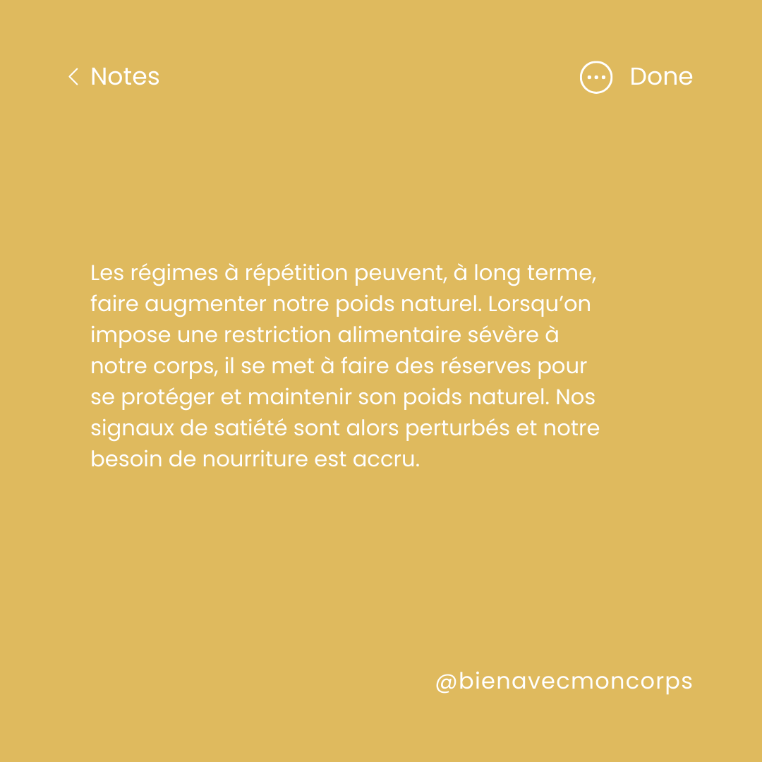 Les régimes à répétition peuvent, à long terme, faire augmenter notre poids naturel. Lorsqu’on impose une restriction alimentaire sévère à notre corps, il se met à faire des réserves pour se protéger et maintenir son poids naturel. Nos signaux de satiété sont alors perturbés et notre besoin de nourriture est accru.