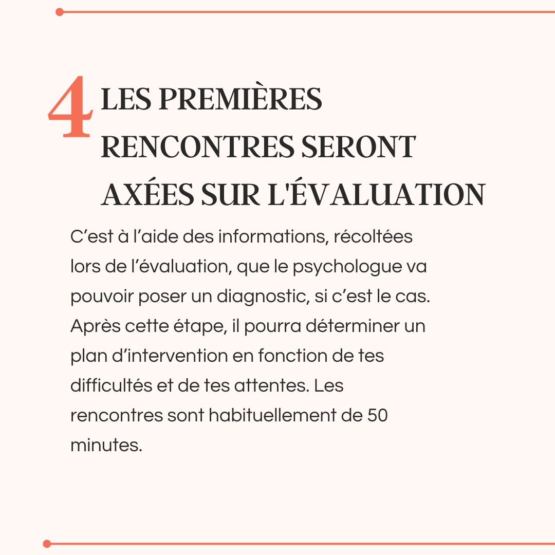 Habituellement, les premières rencontres consistent en l’évaluation. C’est à l’aide de l’information que le psy va récolter lors de l’évaluation qu’il va pourvoir poser un diagnostic (si c’est le cas) et déterminer un plan d’intervention en fonction des difficultés et des attentes du patient. Suite à l’évaluation, l’intervention débute. Les rencontres sont habituellement de 50 minutes.