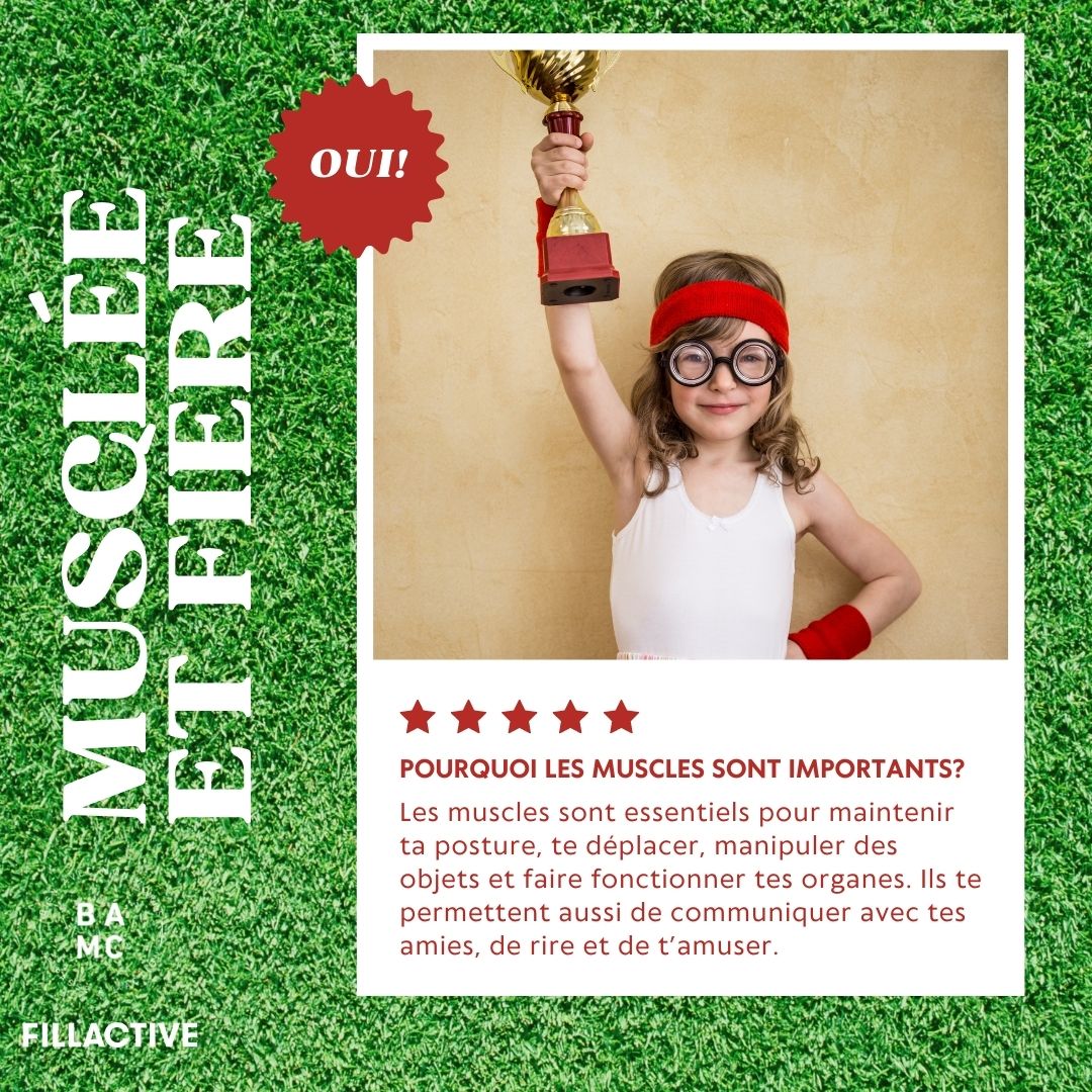 Les muscles sont essentiels pour maintenir ta posture, te déplacer, manipuler des objets et faire fonctionner tes organes. Ils te permettent aussi de communiquer avec tes amies, de rire et de t’amuser.