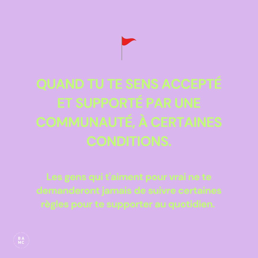 4. Quand tu es accepté et supporté par une communauté, mais sous certaines conditions. Les gens qui t’aiment pour vrai ne te demanderont jamais de suivre certaines règles pour te supporter au quotidien.