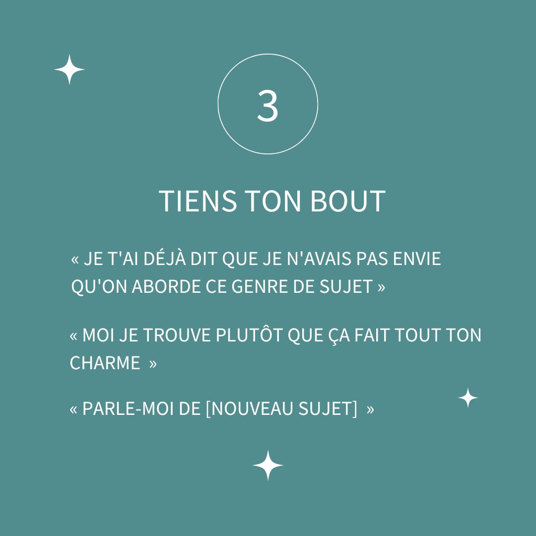 « Je t’ai déjà dit que je préfèrerais qu’on parle d’autres sujets ensemble ».