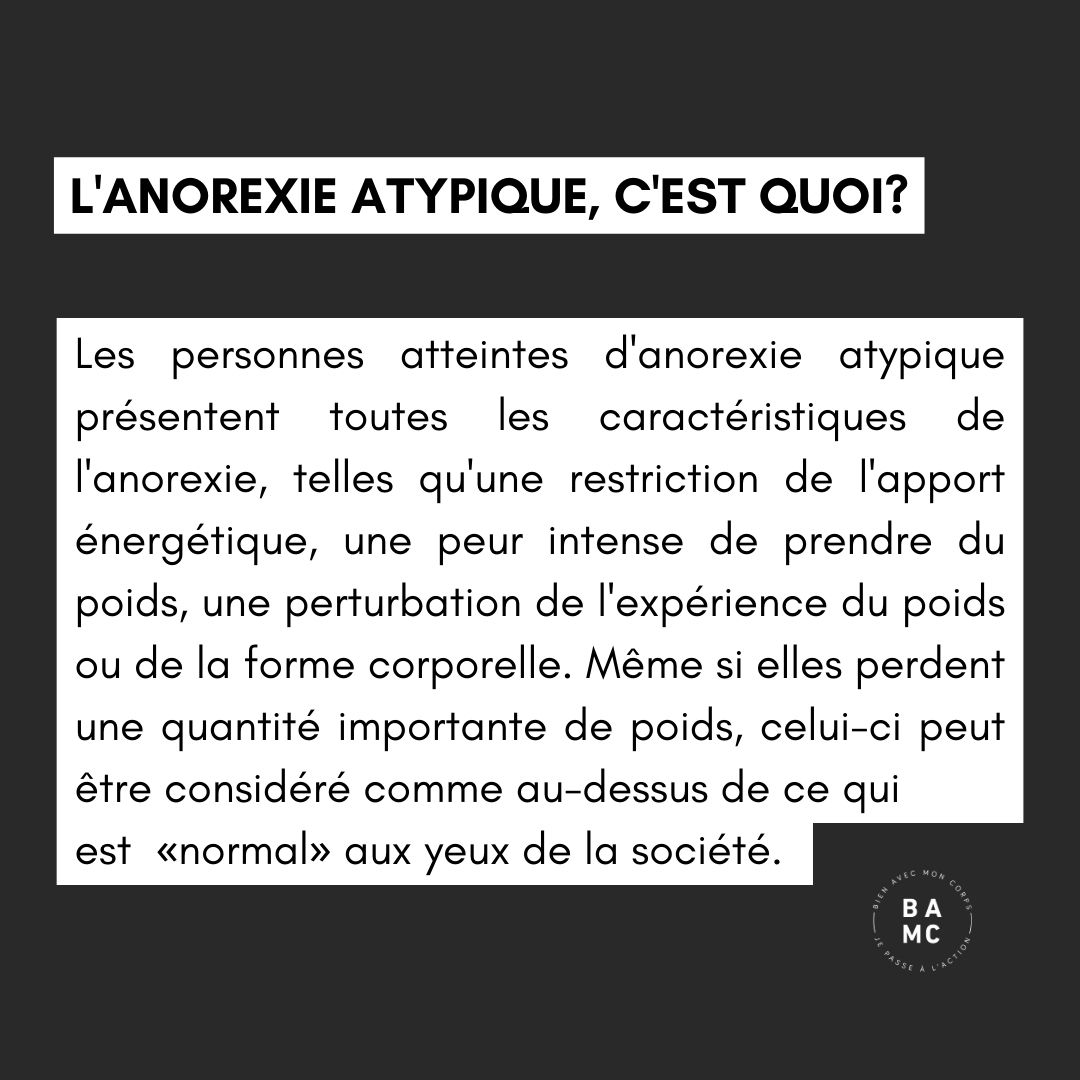 On parle d’anorexie atypique lorsqu’une personne présente toutes les caractéristiques de l’anorexie, comme une restriction de l’apport énergétique, une peur intense de prendre du poids, une perturbation de l’expérience du poids ou de la forme corporelle.