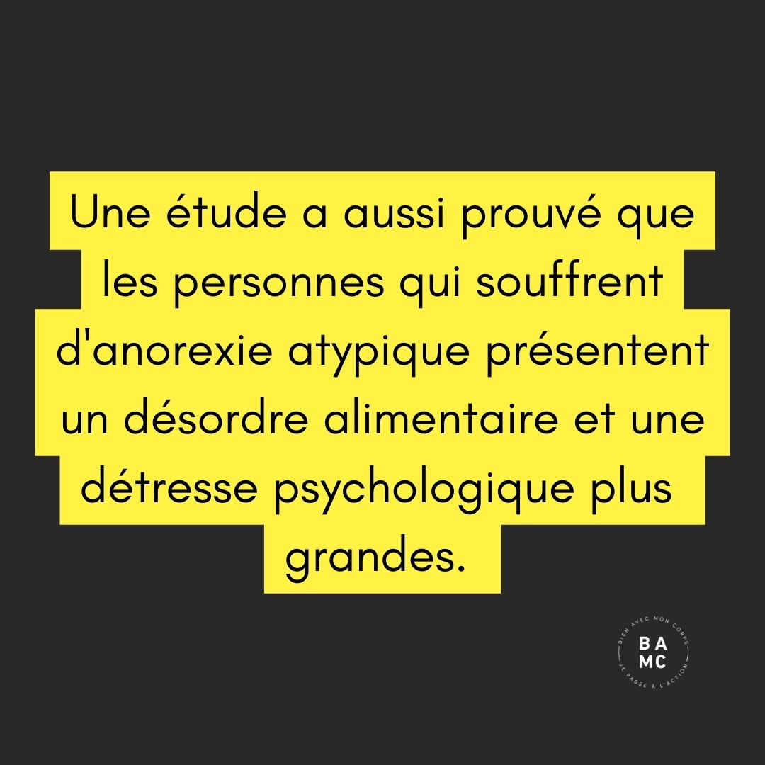 S’il est aussi important d’en parler c’est qu’une étude a aussi prouvé que les personnes qui souffrent d’anorexie atypique présentent un désordre alimentaire ainsi qu’une détresse psychologique plus importante.
