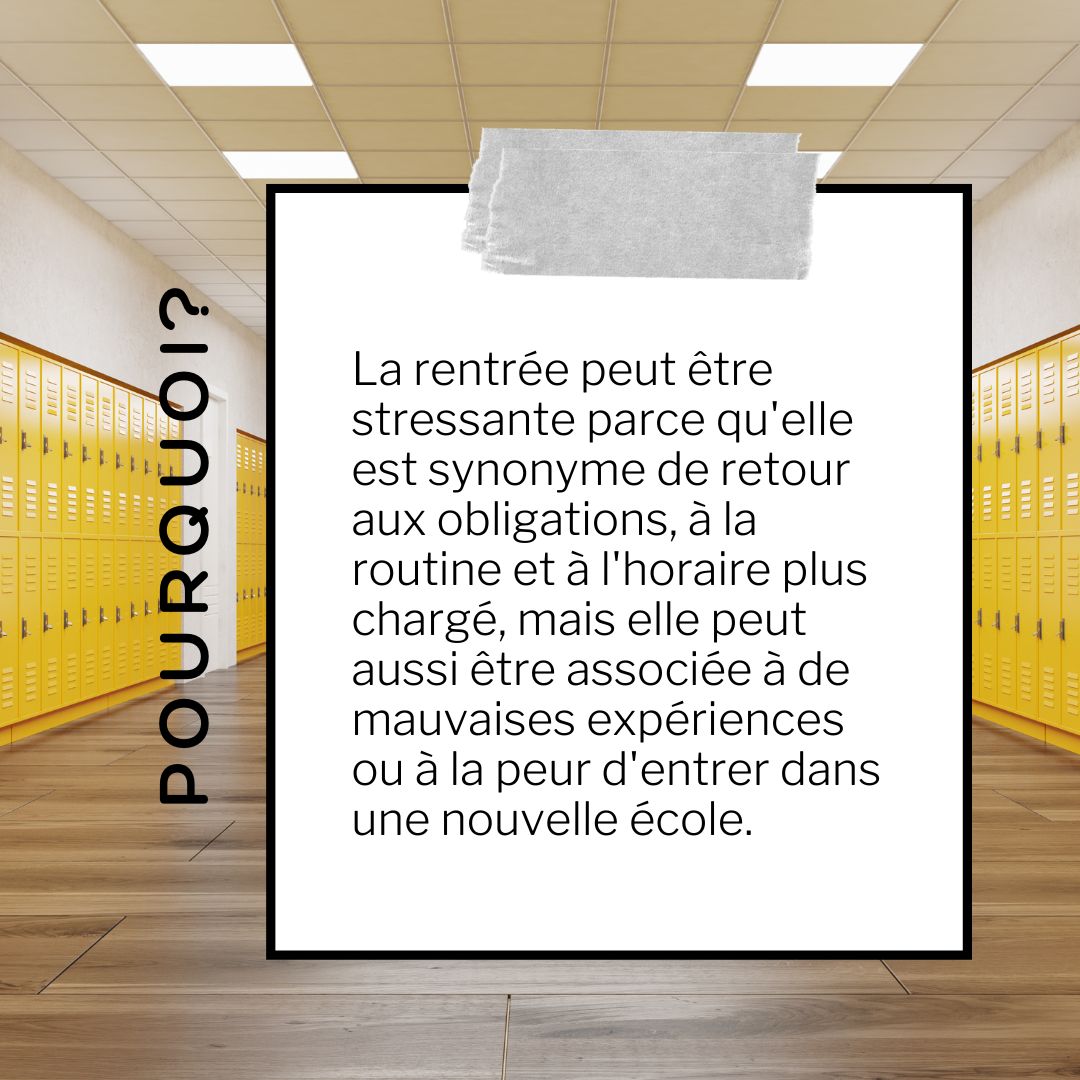 Pourquoi la rentrée scolaire est stressante? Pour plusieurs, la rentrée est synonyme du retour aux obligations, à la routine et à un horaire plus chargé. Pour d’autres, la rentrée sera le moment de faire face à un nouveau défi ou à un nouvel environnement.