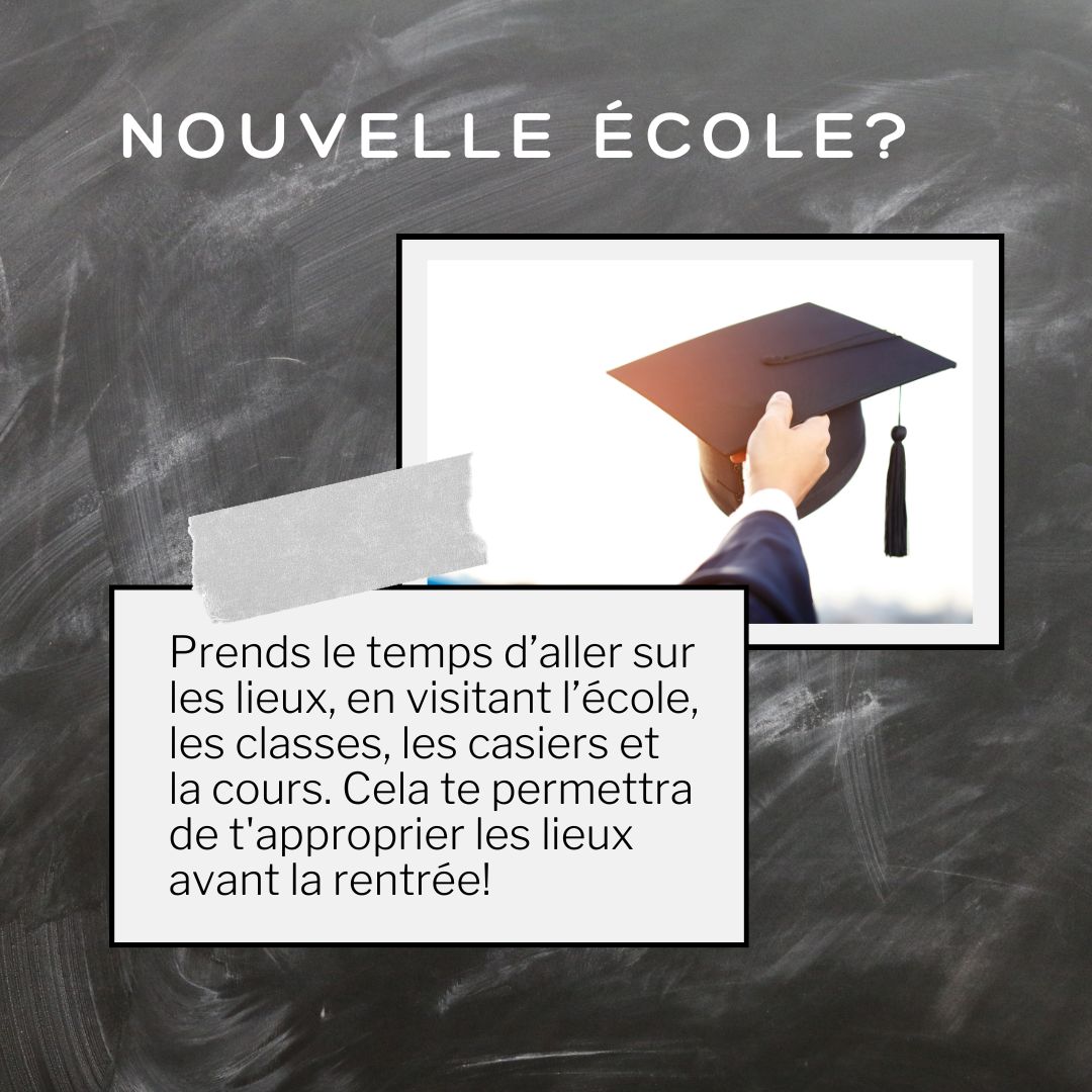 Pour certains, la rentrée sera vécue dans une nouvelle école et un nouveau quartier. Si c’est le cas, cela signifie souvent qu’une anticipation ou une anxiété supplémentaire pourrait être vécue. Avant le moment de la rentrée, prends le temps d’aller sur les lieux en visitant l’école, les classes, les casiers et la cour d’école. Cela te permettra d’apprivoiser ton nouvel environnement.De la même manière, si tu as déménagé dans un nouveau quartier durant l’été, n’hésite pas à fraterniser avec tes nouveaux voisins. Cela te permettra de tisser des liens avec d’autres enfants et de te sentir moins seul au moment de la rentrée.