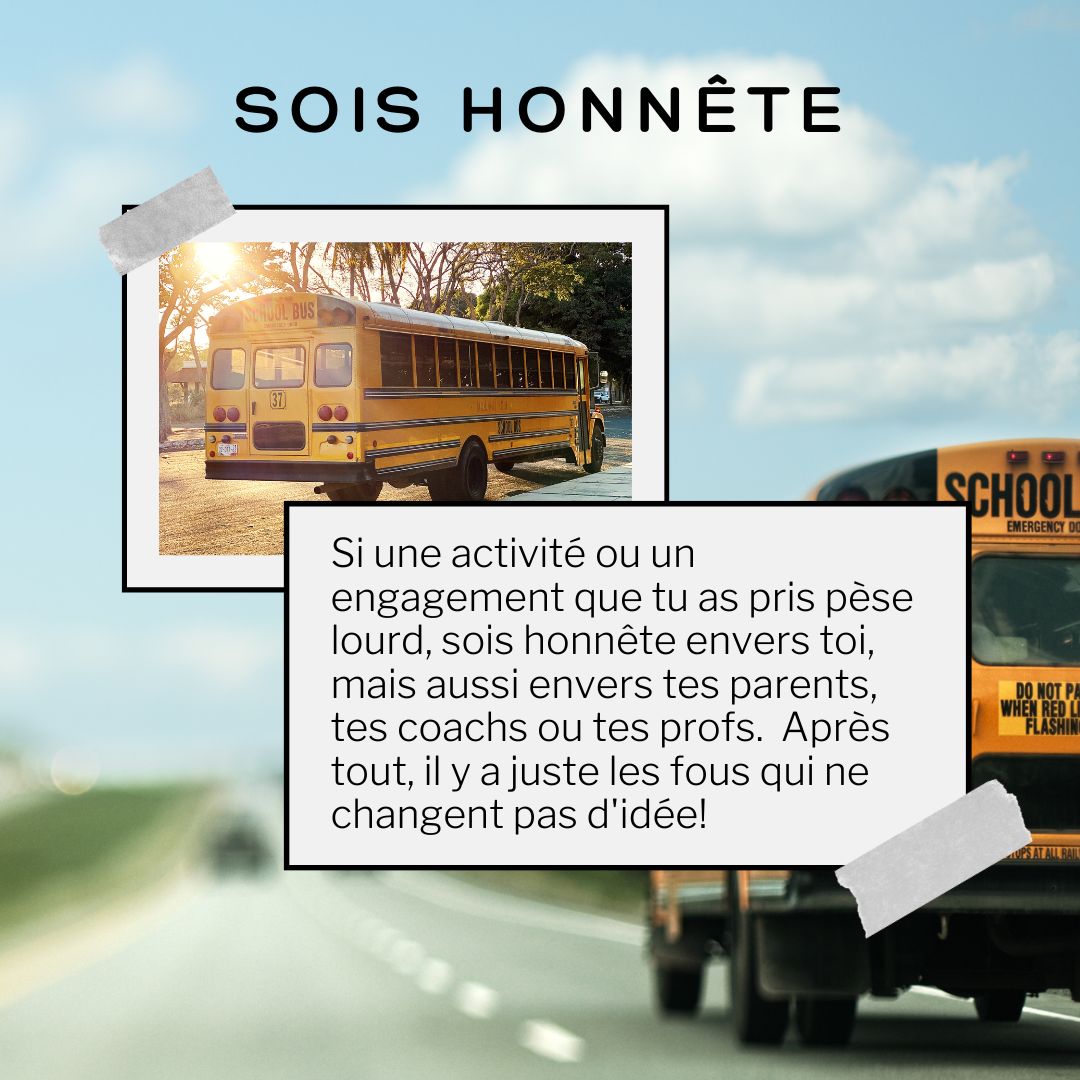 La période de l’été, avec ses journées plus longues, est souvent associée à une routine plus souple et à des heures de lever et de coucher plus tardives. Le fait d’avoir moins d’obligations, de ne pas avoir à faire de devoirs et/ou à assister à des activités parascolaires te permet d’avoir plus de temps pour t’amuser. Mais, ça peut aussi t’amener à être plus désorganisé. La rentrée peut donc être un choc lorsque doit retrouver une routine du jour au lendemain. C’est pour cette raison qu’on te suggère de commencer, quelques jours avant la rentrée, à te coucher et à te lever plus tôt afin que la transition à l’horaire scolaire se fasse plus facilement.