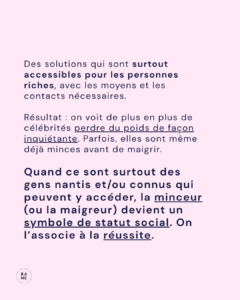Quand ce sont surtout des gens nantis et/ou connus qui peuvent y accéder, la minceur (ou la maigreur) devient un symbole de statut social. On l’associe à la réussite.