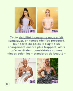 Cette visibilité incessante nous a fait remarquer, en temps réel (ou presque), leur perte de poids. Il s’agit d’un changement encore plus frappant, alors qu’elles étaient considérées comme minces selon les « standards de beauté ».