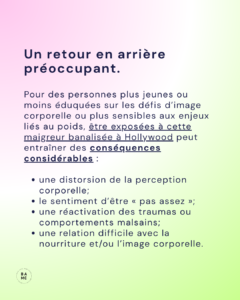 Pour des personnes plus jeunes ou moins éduquées sur les défis d’image corporelle ou plus sensibles aux enjeux liés au poids, être exposées à cette maigreur banalisée à Hollywood peut entraîner des conséquences considérables :